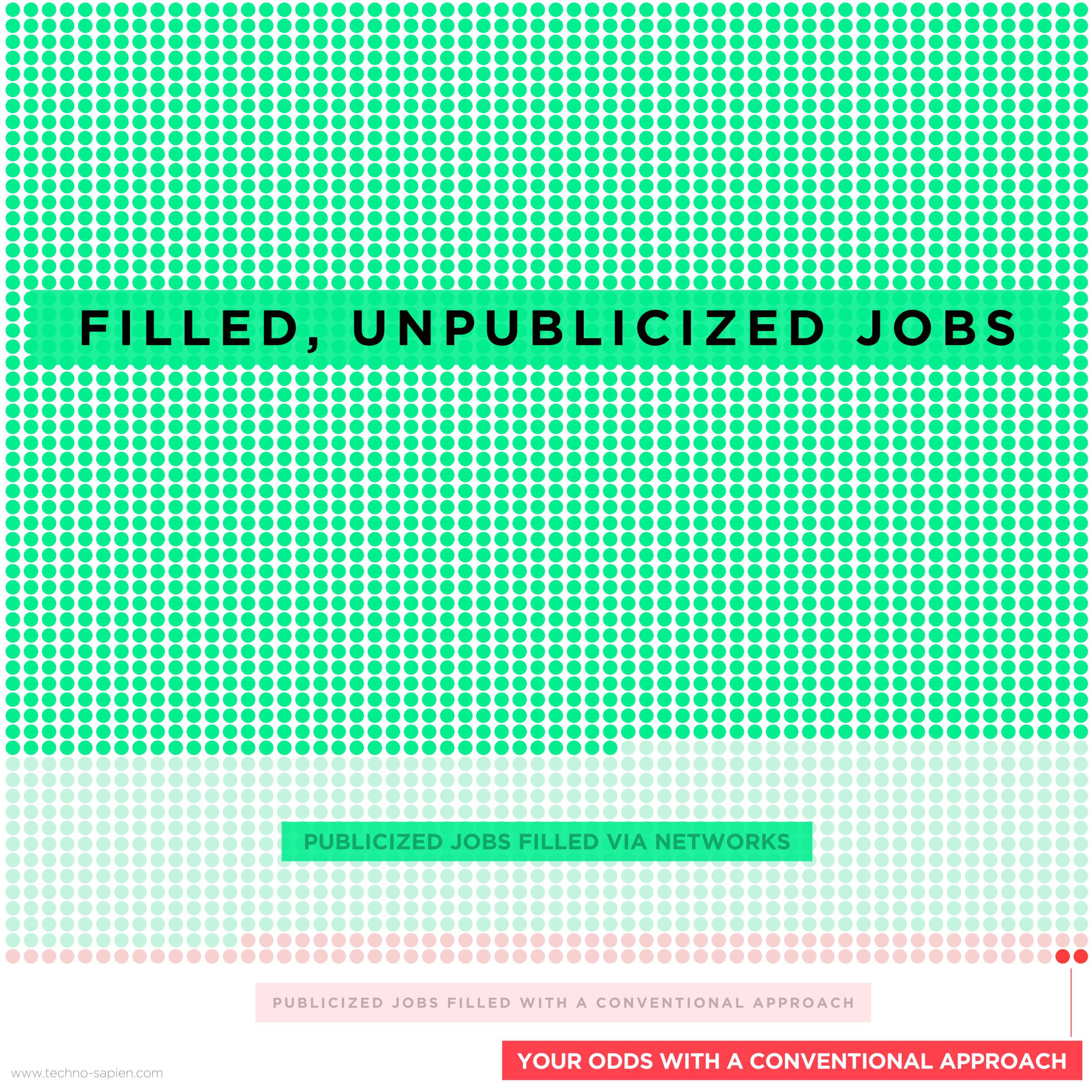The biggest job search myth, debunked, explains that 80% of jobs never make it to a job board. And of those, 15% are filled by 2% of applicants. That means less than 1% of jobs are filled via the old apply-and-hope model.